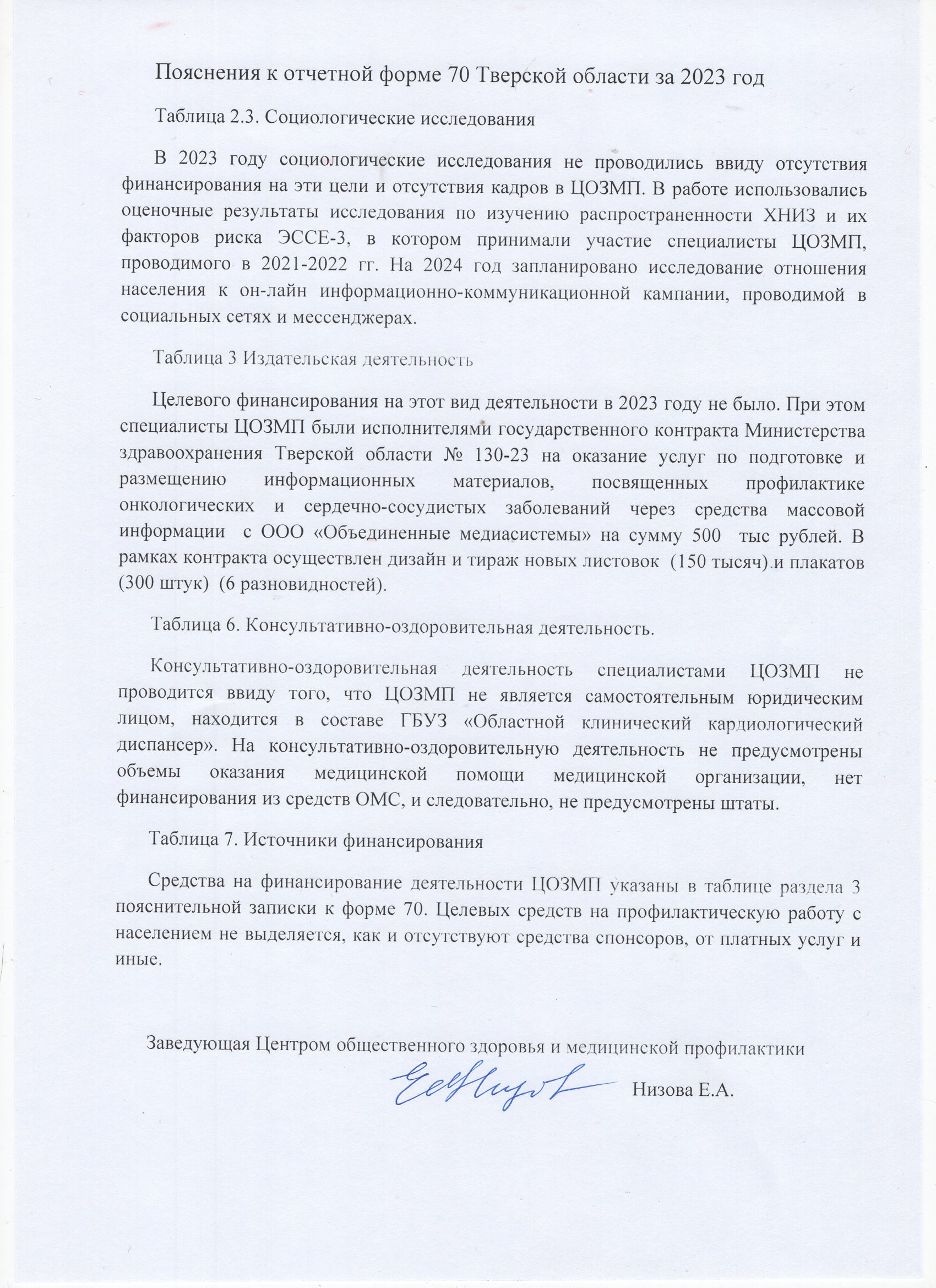 Пояснительная записка к отчету о деятельности Центра общественного здоровья и медицинской профилактики Тверской области (Форма 70) за 2023 год